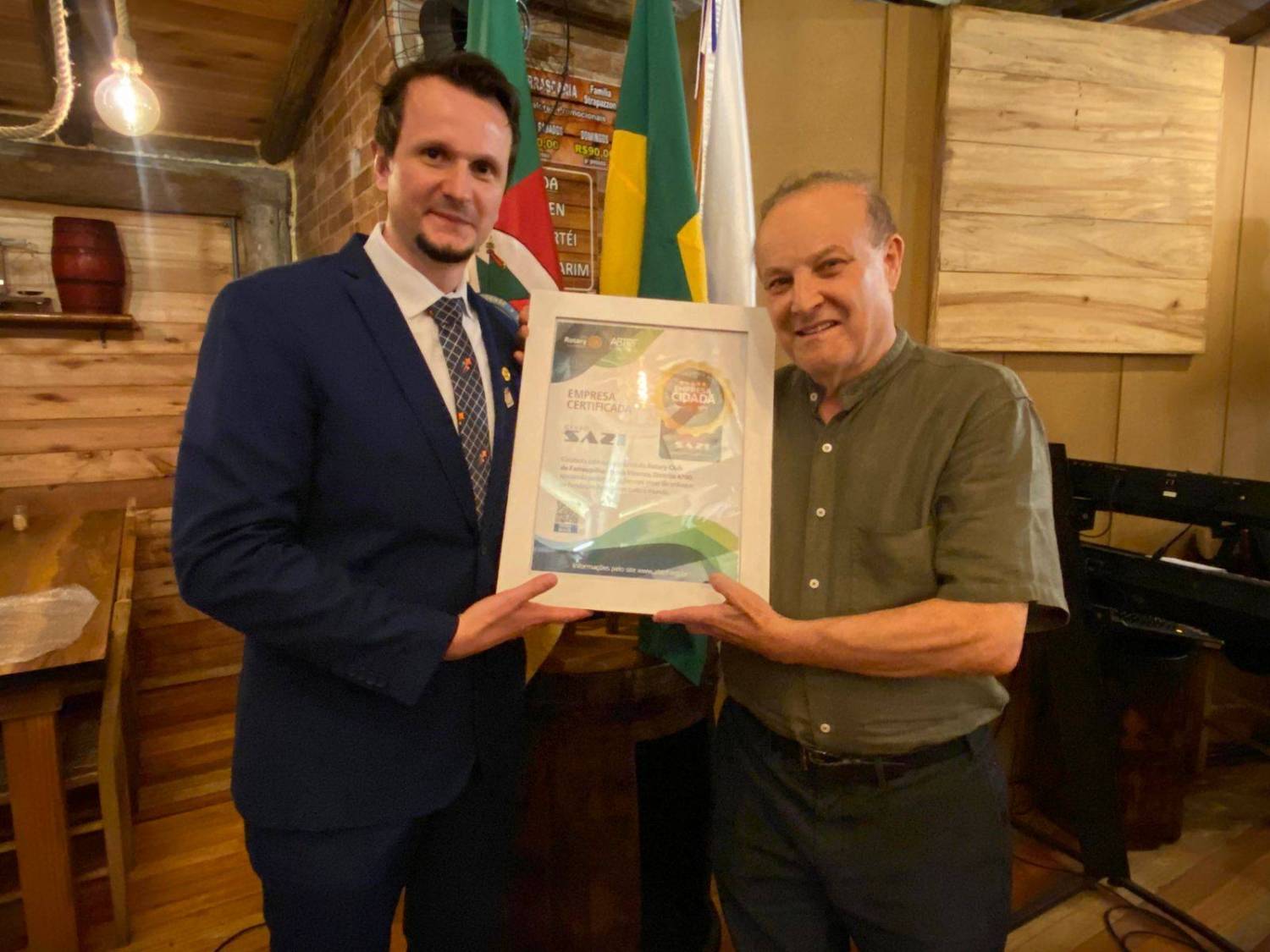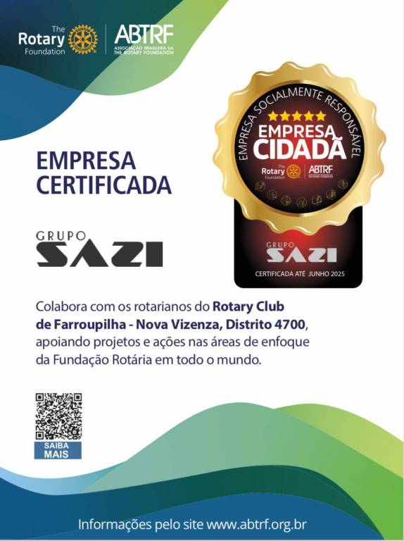Temos a honra de anunciar que o Grupo Sazi é agora uma Empresa Cidadã certificada pelo Rotary Club Farroupilha - Nova Vicenza, Distrito 4700. Este reconhecimento celebra o compromisso da empresa com projetos e ações voltados para o bem-estar social e desenvolvimento das comunidades apoiadas pela Fundação Rotária.