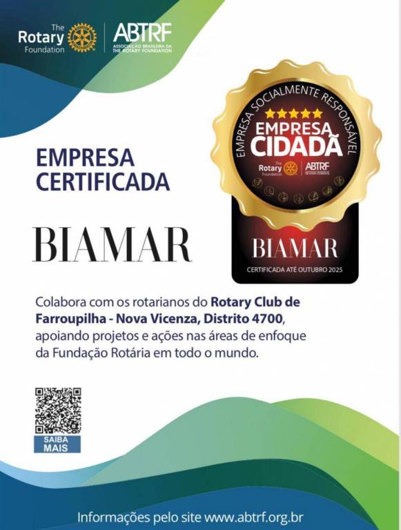 Temos a honra de anunciar que a Biamar é agora uma Empresa Cidadã certificada pelo Rotary Club Farroupilha - Nova Vicenza, Distrito 4700. Esta conquista é um reconhecimento pela colaboração contínua com os projetos e ações voltados para o bem-estar social e desenvolvimento das comunidades apoiadas pela Fundação Rotária.